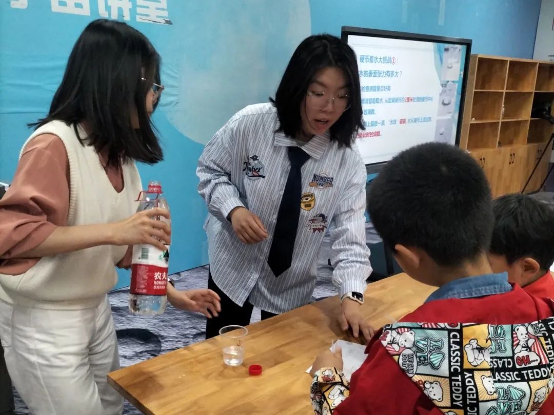 《硬币蓄水大挑战》课程由乐育党支部林杉同志主讲,苏慧岚同志担任助教。本课程通过观察硬币上水珠的形态及统计硬币上可以承载的水滴、酒精液滴、肥皂水液滴的数量,来让学生们深入理解表面张力的概念及其作用。