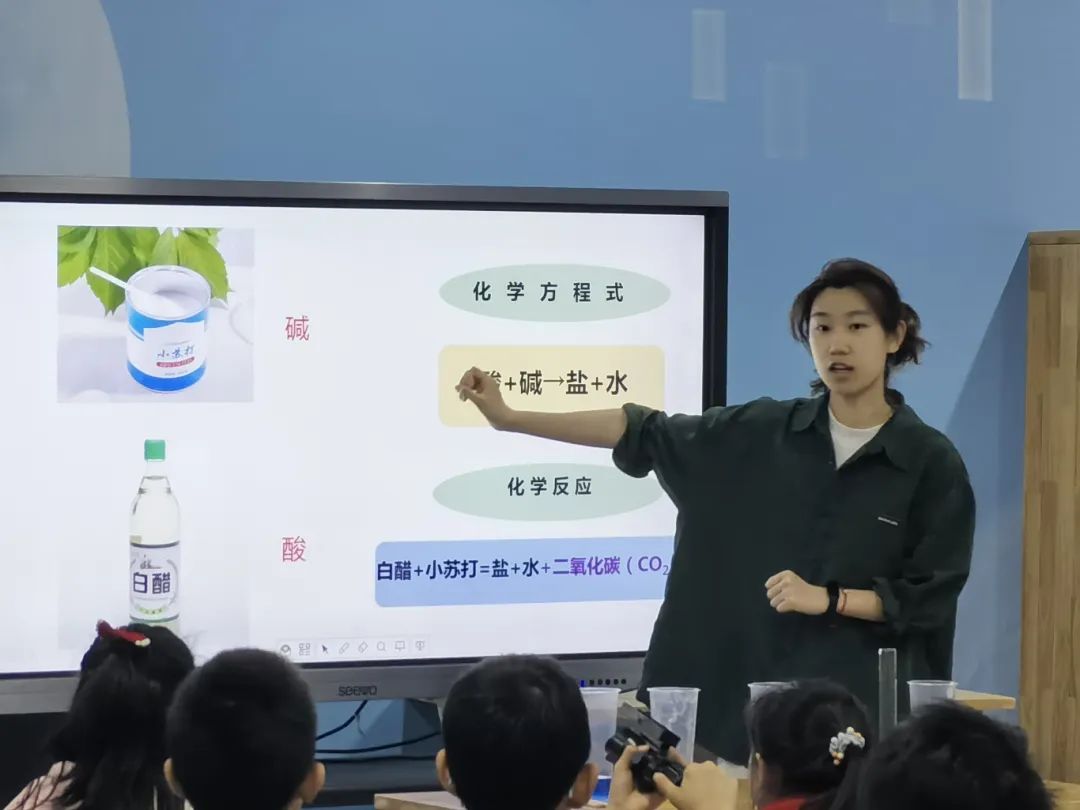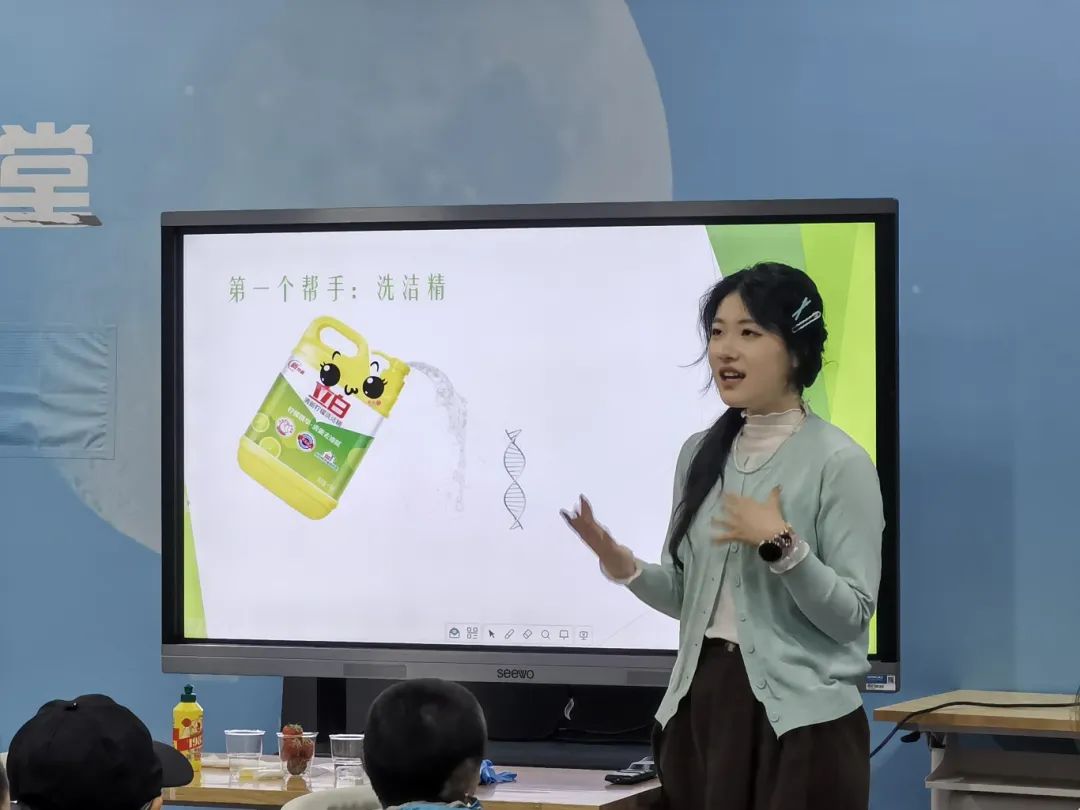 在拓展提升环节,主讲人带领小朋友们学习了几点生活小妙招,介绍小苏打和白醋在清洁方面的应用。最后,主讲人提出“小苏打混合白醋能去除厨房重油污吗”这一问题,引发小朋友们根据课堂内容进行思考。