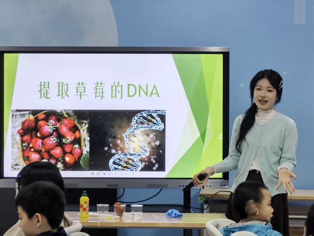 在拓展思考环节,主讲人鼓励小朋友们思考使用草莓作为原料的原因。小朋友们积极思考,踊跃发言,主讲人也顺着小朋友们的思路进一步向他们拓展了遗传物质、染色体的概念。
