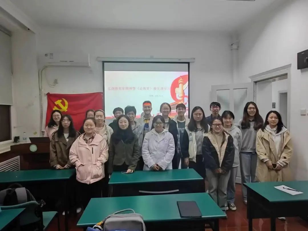 两位同志分享了他们的学习感悟。一位同志表示,通过今天的学习,对教师节的来源有了更深的认识,并对《论教育》一书有了初步的了解,特别是对培养德智体美劳全面发展的社会主义建设者和接班人的重要性有了深刻印象。马明浩同志则分享了他对教育的深刻感悟,强调了作为未来人民教师的责任,以及在教育下一代时塑造意志品质的重要性。