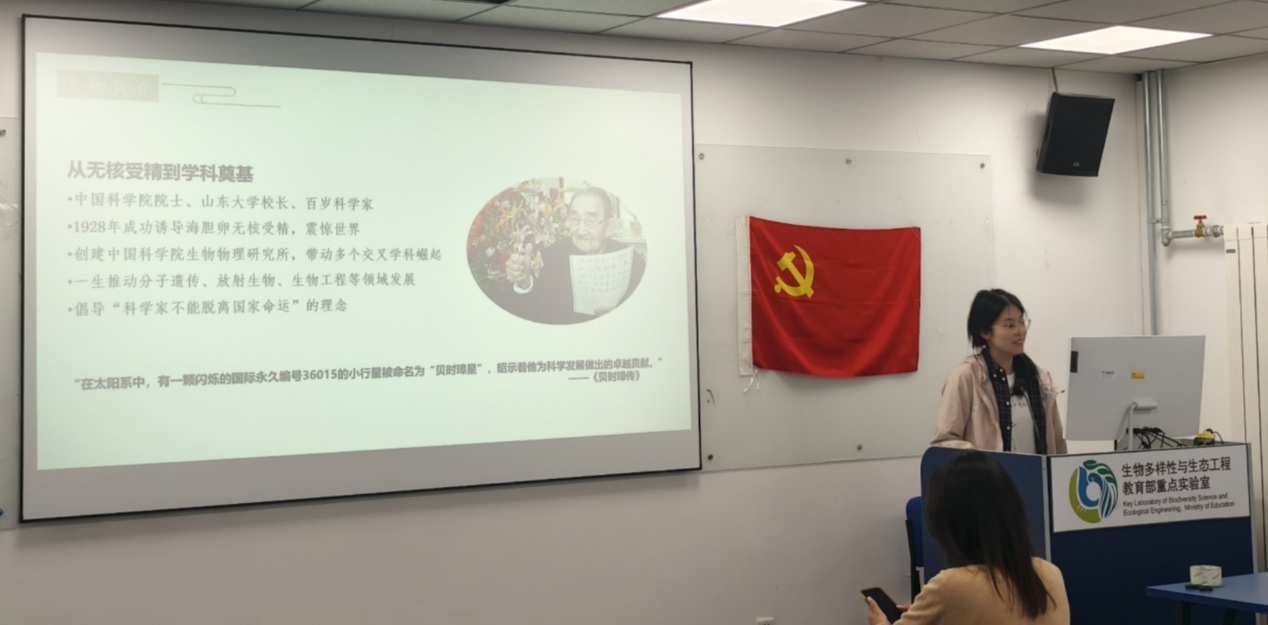 2025年4月30日晚,立身党支部陈瑶同志于生态楼A105开展第十二期“立身说”分享活动。陈瑶同志以“贝时璋与新时代科研任务”为主题,深情讲述了“百岁科学家”、中国科学院院士贝时璋的精彩事迹。