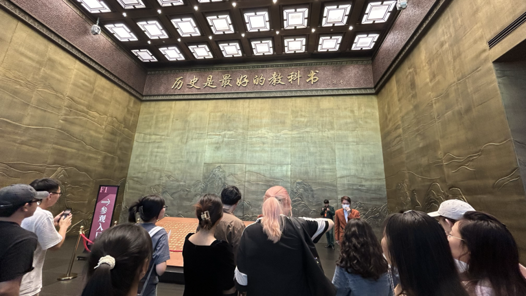 在庄严肃穆的中国考古博物馆前,支部成员们合影留念,随后在讲解员的带领下进入博物馆。序厅上方,“历史是最好的教科书”几个大字引人注目——习近平总书记的这句名言提醒我们,无论未来从事何种职业,都要以史为鉴,从历史中汲取智慧与力量。在见证了党的二十大召开的“星空穹顶”的照耀下,在结构精巧的殷商马车的伴行下,支部成员们缓步走过序厅的“历史大道”,开启了追寻中华文明之根的旅程。