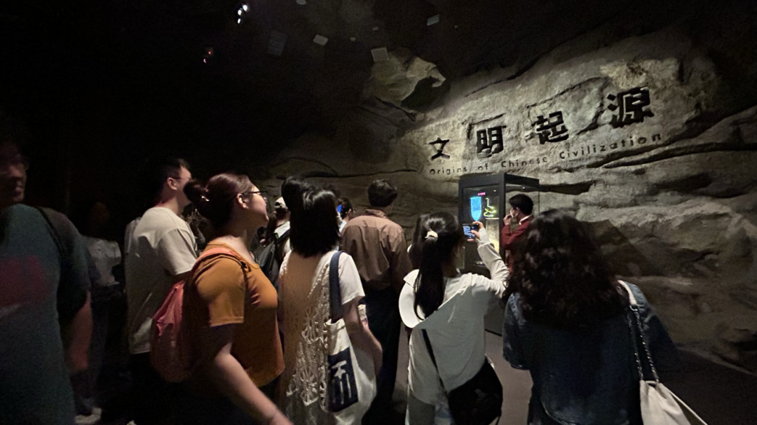 在二楼的“文明起源”展厅,支部成员们细细观赏了刻有汉字雏形的大口陶尊、记录古人面容的陶人面像和考古发掘出的炭化农作物,仿佛穿越时空,与祖先们进行了一场隔空对话。