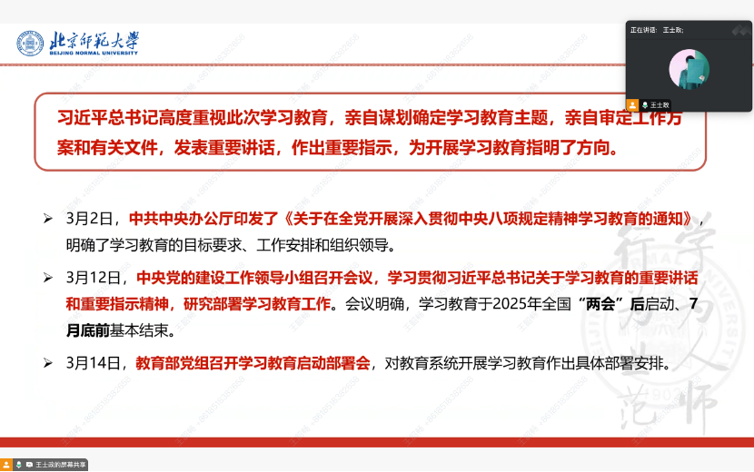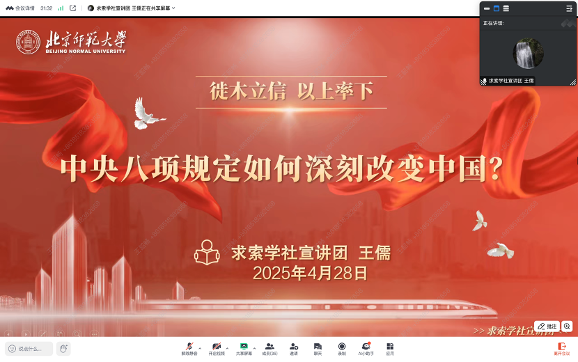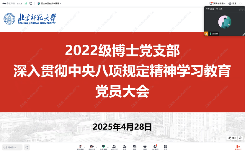 为推动深入贯彻中央八项规定精神学习教育走深走实,持之以恒抓好党的理论学习,根据中央统一部署及上级党委相关要求,2025年4月28日,2022级博士党支部开展深入贯彻中央八项规定精神学习教育党员大会,学习领会和贯彻落实中央八项规定及其实施细则精神。专题学习会包括支部书记讲党课和《徙木立信,以上率下——中央八项规定如何深刻改变中国?》宣讲两个环节。支部全体成员参加了本次活动。