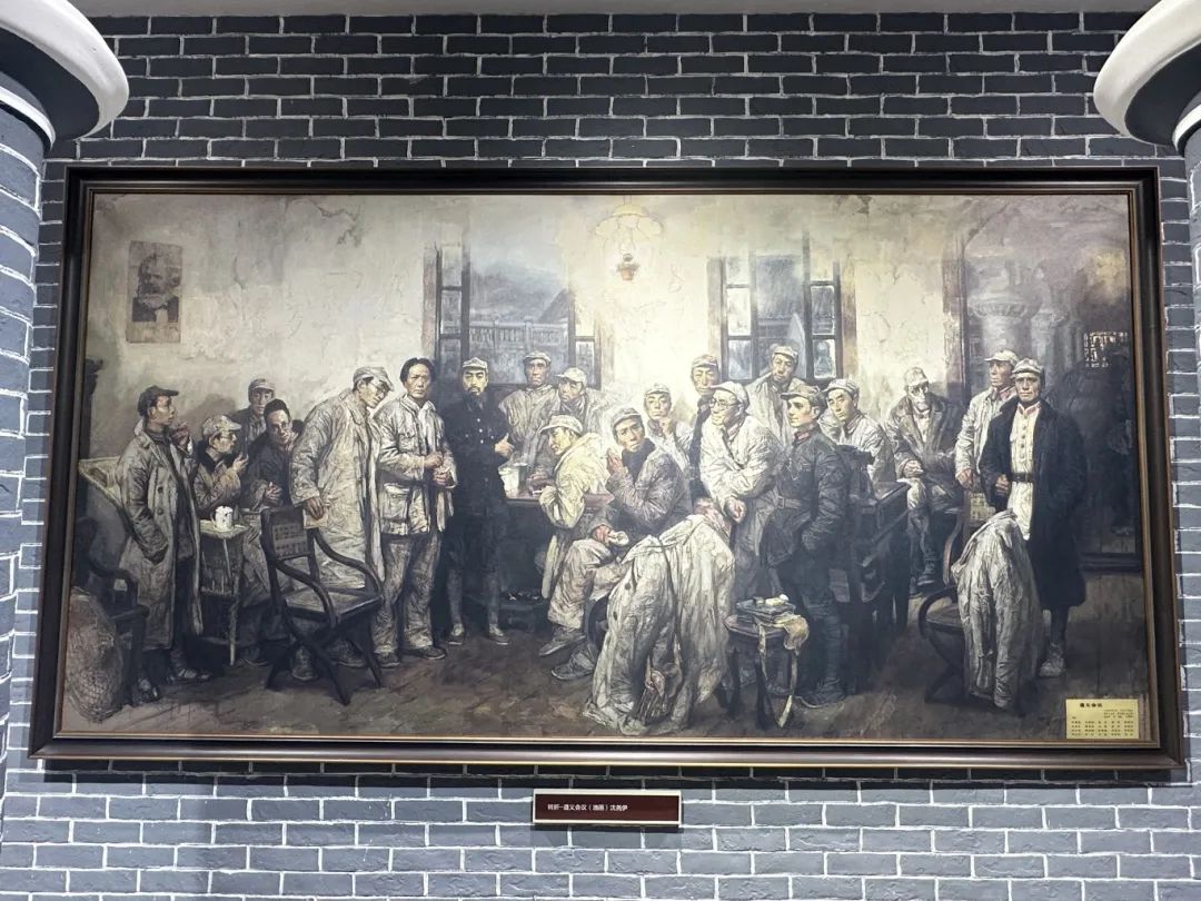 图片展示了遵义会议的油画,遵义会议是中国共产党于1935年1月在长征途中于贵州遵义召开的政治局扩大会议。此次会议是在第五次反“围剿”失败、红军遭受重大损失的危急关头召开的,重点批判了博古、李德等人的“左”倾军事错误,结束了教条主义在党内的主导地位。