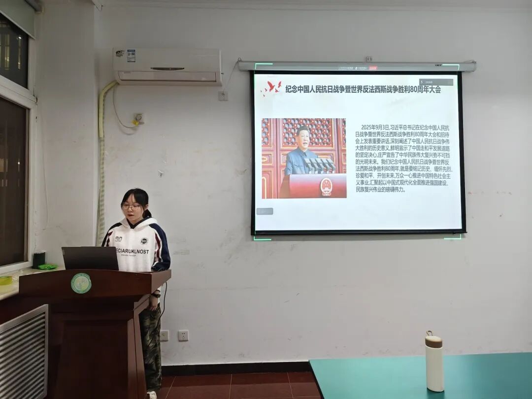 最后,杨芷若同志以《在新时代继承和弘扬伟大抗战精神》为题,分享了对伟大抗战精神的深刻理解与感悟。她通过习近平总书记的讲话回顾了抗战精神的内涵,强调了爱国情怀、民族气节、英雄气概和必胜信念的重要性。她呼吁新时代青年要从抗战精神中汲取力量,勇担历史责任,坚守道德底线,不畏困难,为实现中华民族的伟大复兴贡献青春力量。
