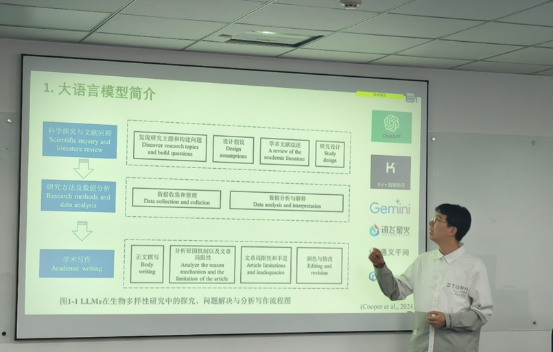 讲座中,谷际岐同学以生态学研究为切入点,从LLMs的基本原理出发,梳理其发展脉络与技术特点,全方位对比主流模型(如GPT、DeepSeek等)的适用场景。并通过理论讲解、案例剖析与实时演示相结合的方式,生动展示了LLMs如何贯穿文献调研、实验设计、数据分析、论文写作与成果传播等科研全流程。