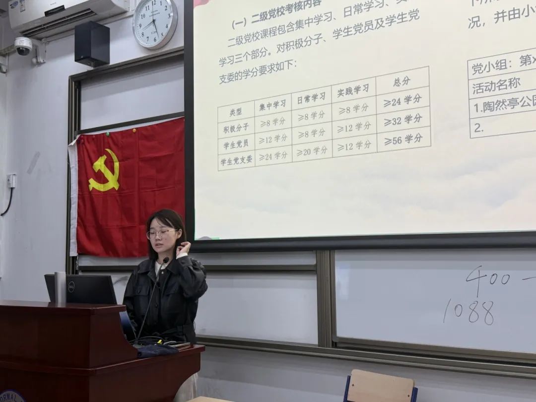 纪检委员戴露莹同志介绍了二级党校学分定期考核方案以及出勤考核与请销假制度,重新规范了二级党校考核内容和支部内二级党校学分记录要求,并强调出勤考核、请假制度和请假纪律的新要求。