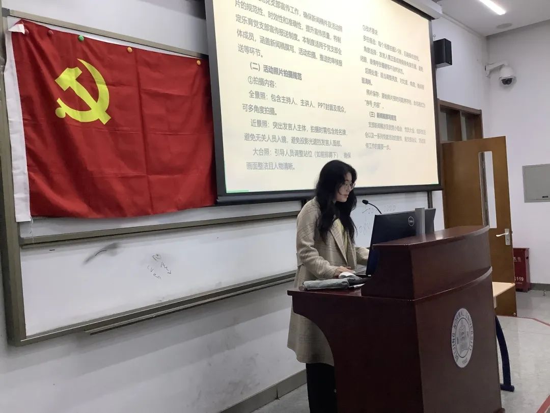 宣传委员张佳轩同志就宣传报送制度进行了汇报。对于活动照片拍摄规范、新闻稿撰写规范、审核与报送流程三个方面的问题进行强调,帮助支部同学了解如何提高文稿撰写和排版能力、及时对接工作。