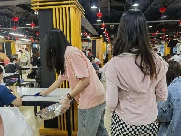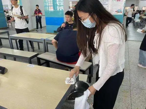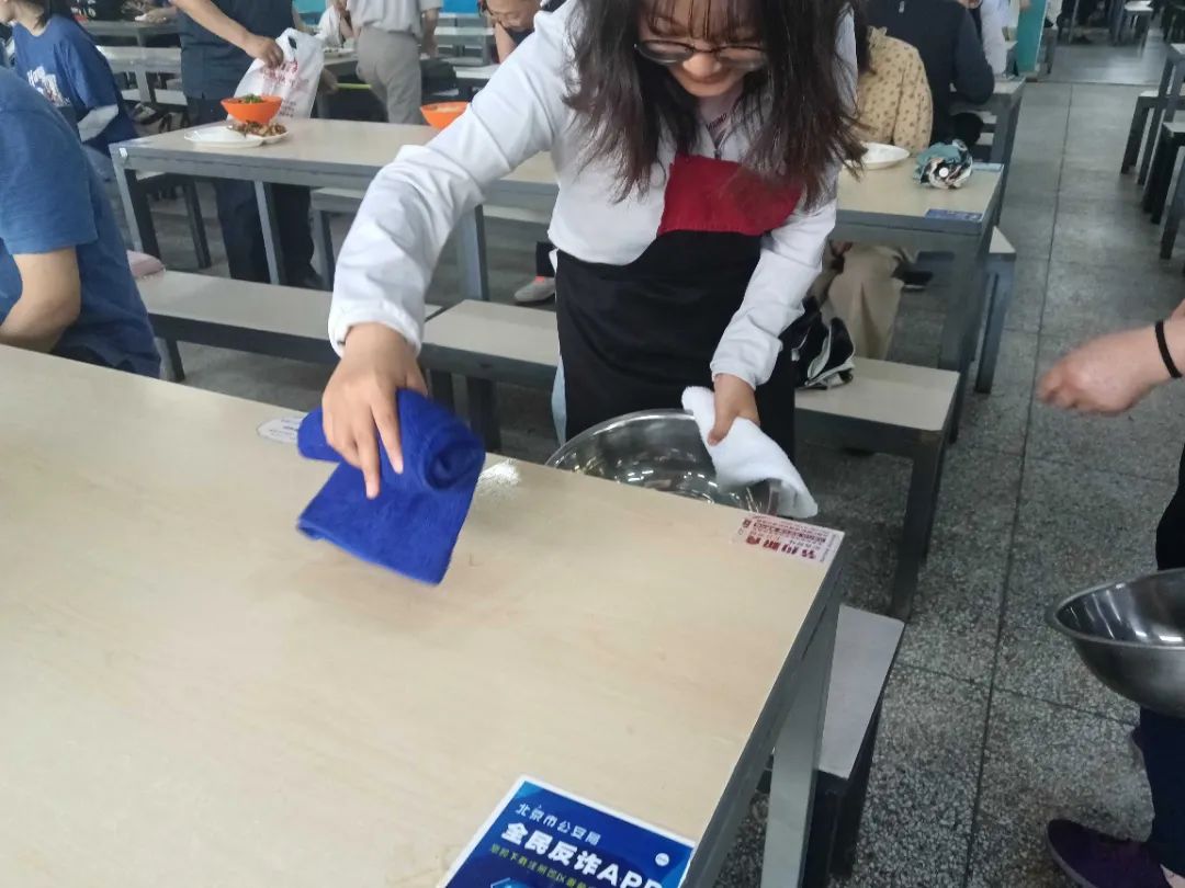 本次活动我主要参与了学五食堂二楼的桌面清洁工作。食堂阿姨告诉我们,毛巾分为两块,一块用洗涤剂浸湿,用于擦拭桌面上的油污,另一块为干毛巾,用于将湿毛巾擦拭过的桌子上残留的水渍和洗涤剂擦走。端着铁盆在食堂中巡回打扫的时候,我感受到了这一岗位的重要性,由于午间就餐人流量大,如果不及时清洁脏污的桌面,会导致可用的座位变少,不便于师生就餐。虽然只是短短的一个小时志愿,却也算是“为师生办实事”,也让我体会到了食堂阿姨工作的不容易,感谢她们!