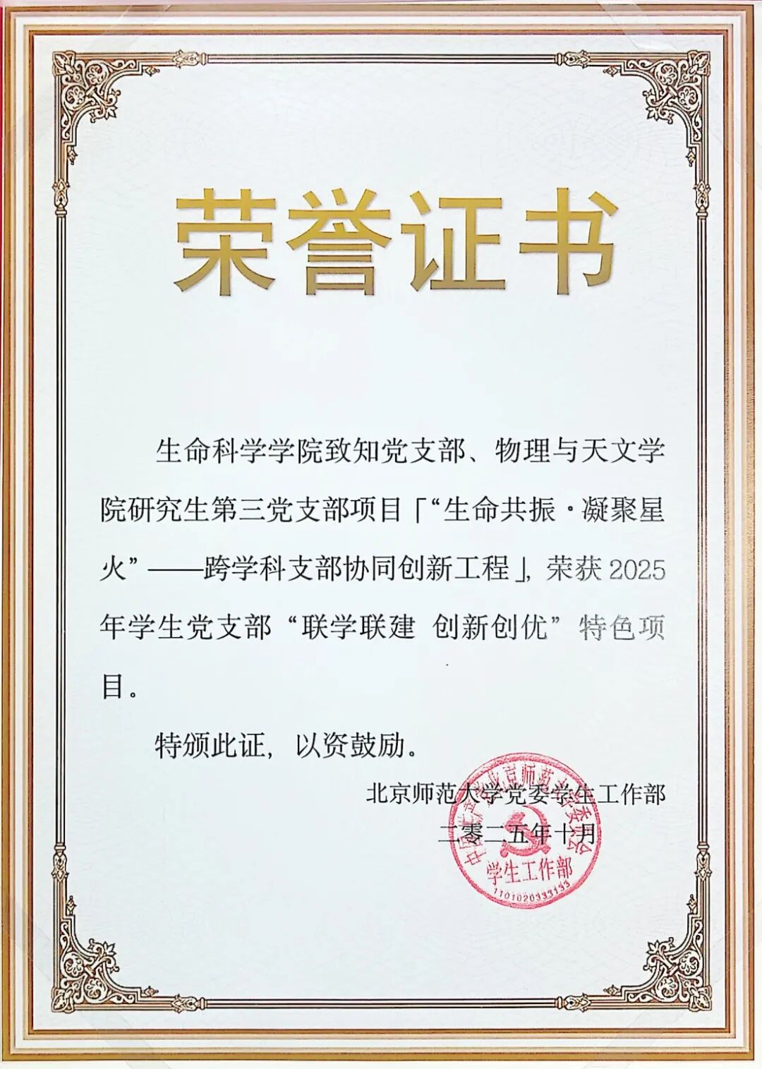 在冰球突破豪华版官方网站2025年学生党支部“联学联建 创新创优”项目评选中,冰球突破豪华版官方网站致知党支部与物理与天文学院研究生第三党支部共建项目“生命共振·凝聚星火”——跨学科支部协同创新工程获评特色项目。