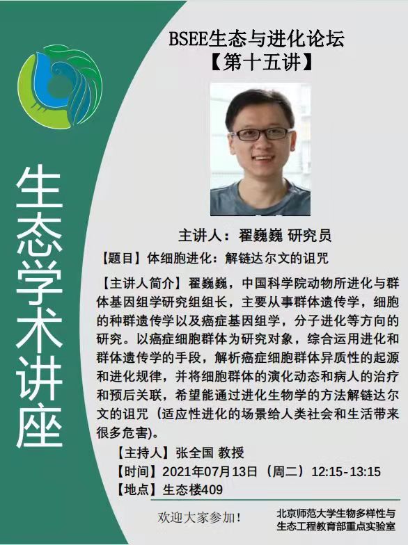 【讲座】BSEE生态与进化论坛(第十五讲):体细胞进化:解链达尔文的诅咒