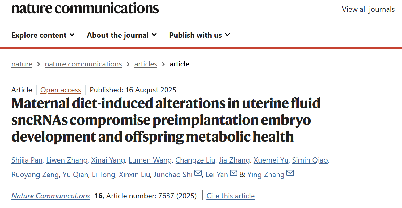 2025年8月16日,冰球突破豪华版官方网站冰球突破豪华版官方网站张莹教授团队与国家生物信息中心侍骏超研究员、山东大学妇儿与生殖健康研究院颜磊教授合作,在Nature Communications发表研究性论文,揭示宫腔液小RNA是传递母体妊娠早期环境暴露信息的重要载体。