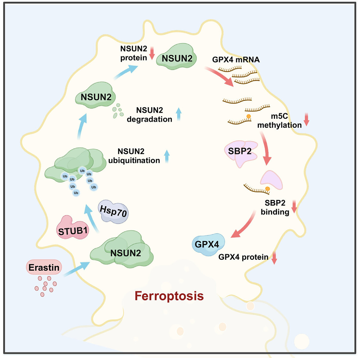 在这项研究中, 研究人员在细胞和动物水平发现NSUN2参与肝细胞铁死亡的调控,缺乏NSUN2增加肝细胞对铁死亡敏感性,这一现象通过回补NSUN2可以被抑制。随后的研究发现,NSUN2是E3泛素连接酶STUB1的新底物,STUB1可以催化NSUN2发生泛素化修饰,导致NSUN2通过泛素-蛋白酶体系统被降解;诱导肝细胞发生铁死亡时,可以促进STUB1介导的NSUN2泛素化修饰和降解。进一步的实验表明,NSUN2参与调控铁死亡重要抑制因子GPX4的表达。NSUN2的下调时GPX4 mRNA 3'-UTR m5C修饰水平降低,导致SBP2与GPX4 mRNA 3'-UTR中硒代半胱氨酸插入序列(SECIS)的互作减弱, 从而抑制SBP2介导的GPX4硒代蛋白翻译。NSUN2的下调会显著抑制GPX4蛋白的表达,增加肝细胞对铁死亡的敏感性。这些结果表明,STUB1-NSUN2-GPX4轴是调控铁死亡的一个新机制,为研发以该信号轴为靶向的肝癌治疗策略提供了实验依据。