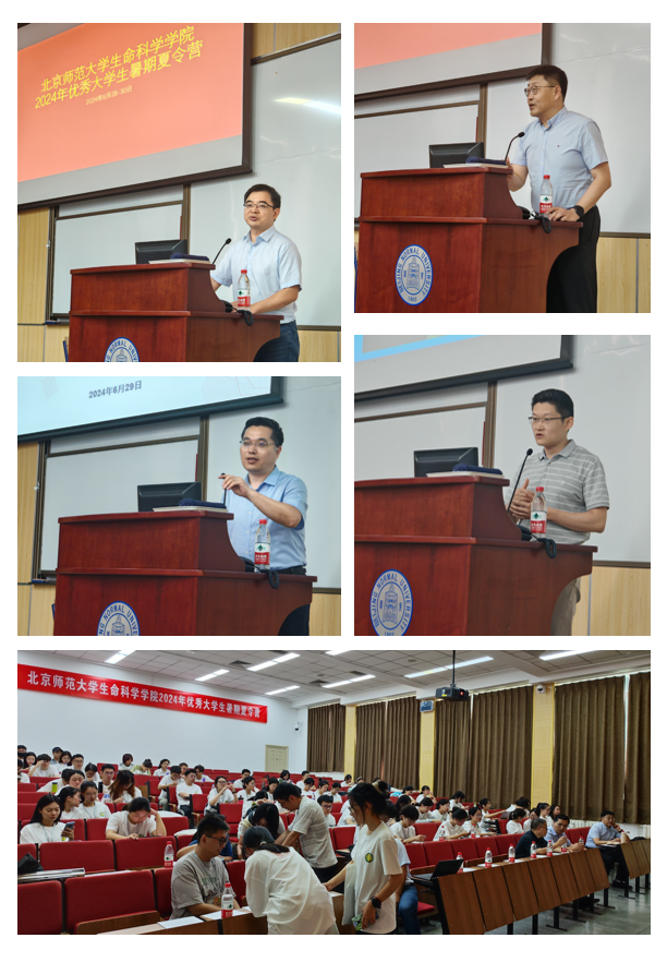 (左上:副院长廖万金致开幕词;右上:生态系系主任邓文洪介绍冰球官网生态学学科情况;左中:生物系系主任张俊杰介绍冰球官网生物学学科情况;右中:副院长席超介绍冰球官网科研平台;下:营员参会现场)