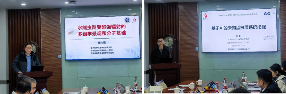 随后,两位国家蛋白质科学中心专家作专题报告。张令强研究员以《水熊虫耐受超强辐射的多组学景观和分子基础》为题,系统分享团队在极端环境生物适应机制研究上的最新进展:通过多组学分析,解析了水熊虫在超高辐射环境下维持生命活性的关键分子机制,为开发新型抗辐射药物和防护策略提供了新的理论框架与候选靶点。常乘副研究员带来题为《基于 AI 的未知蛋白质系统挖掘》的报告,详细介绍了如何通过构建大规模高质量质谱数据集与开发新算法,建立基于预训练模型的解决方案,最终实现对未知蛋白质及其修饰的高效、系统化挖掘,为蛋白质组学研究开辟了新的模式。