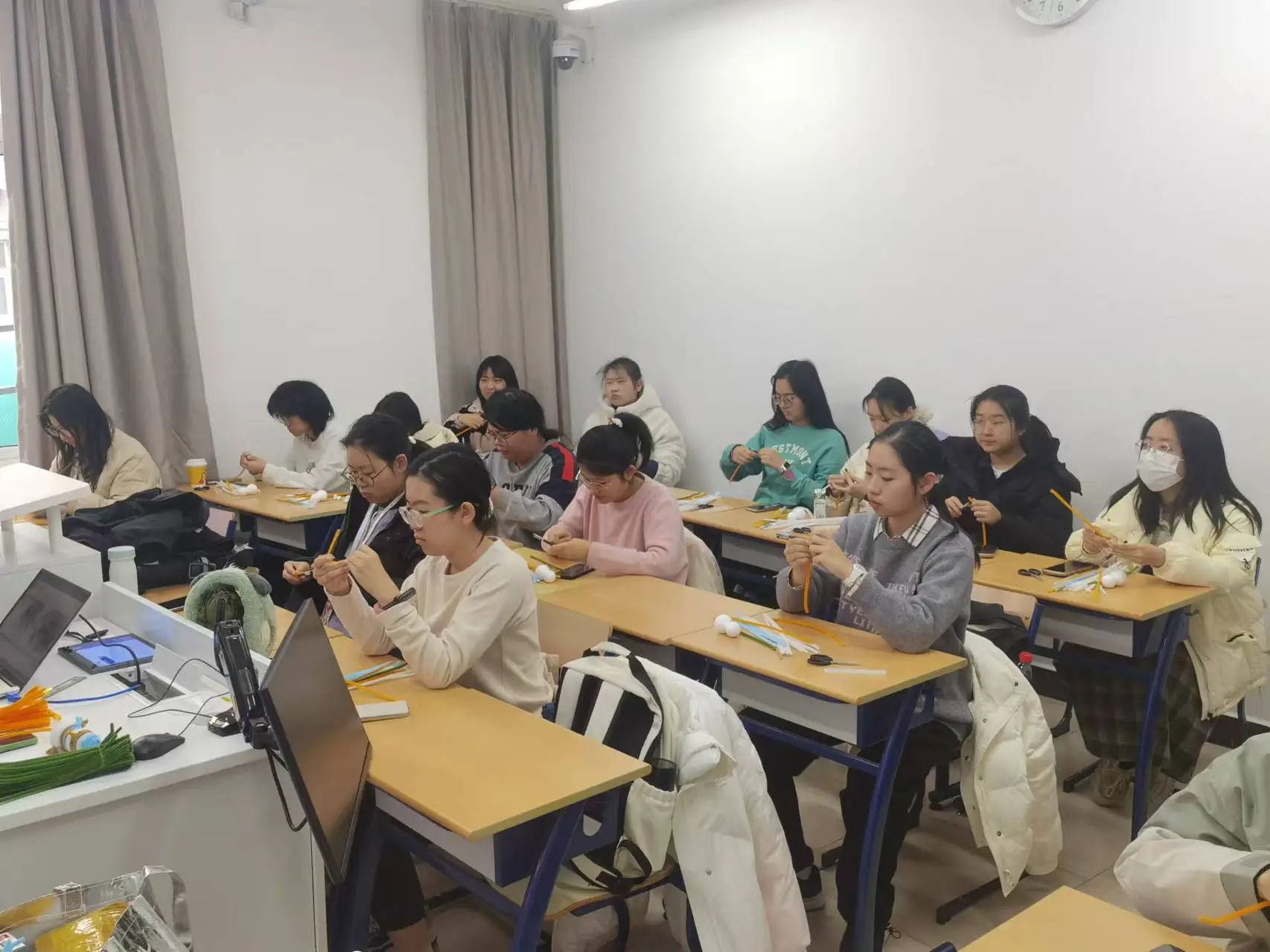 扭扭棒diy活动流程包括制作方法讲解、主持人带领制作和成果展示三部分。同学们制作了小南瓜和小雪人,用自己的灵心巧手让平庸的扭扭棒变成五彩的艺术品:鲜亮的颜色,柔软的触感,让人觉得眼前一亮。更有同学别出心裁,让自己的小雪人围上了围巾,挎上了小包,可爱至极。