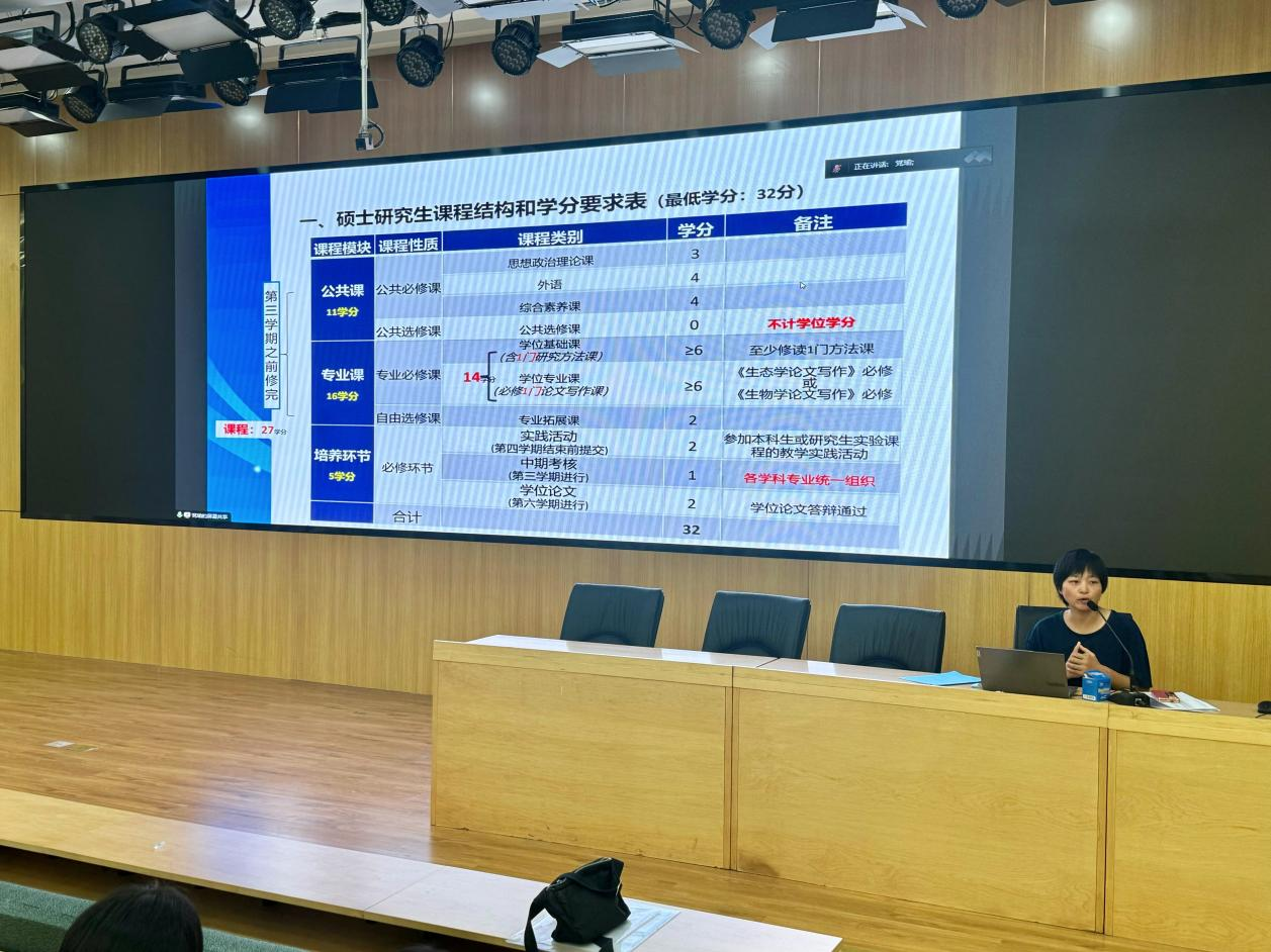随后,研究生教务秘书郭丽然老师详细介绍了研究生的培养计划及课程设置,解读了研究生与博士生的学分要求、毕业条件以及关键时间节点。她提醒同学们应及时关注学业进展,祝愿大家都能够顺利完成学业。