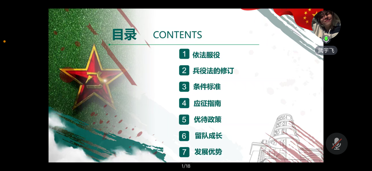 接下来,宣讲团成员武宇飞从依法服役、兵役法的修订、条件标准等七个方面为大家详细解读了征兵政策,对报名入伍的时间节点、应征入伍标准及优待政策等大家重点关心的内容进行了针对性解读,并一一解答了同学们提出的各项问题。