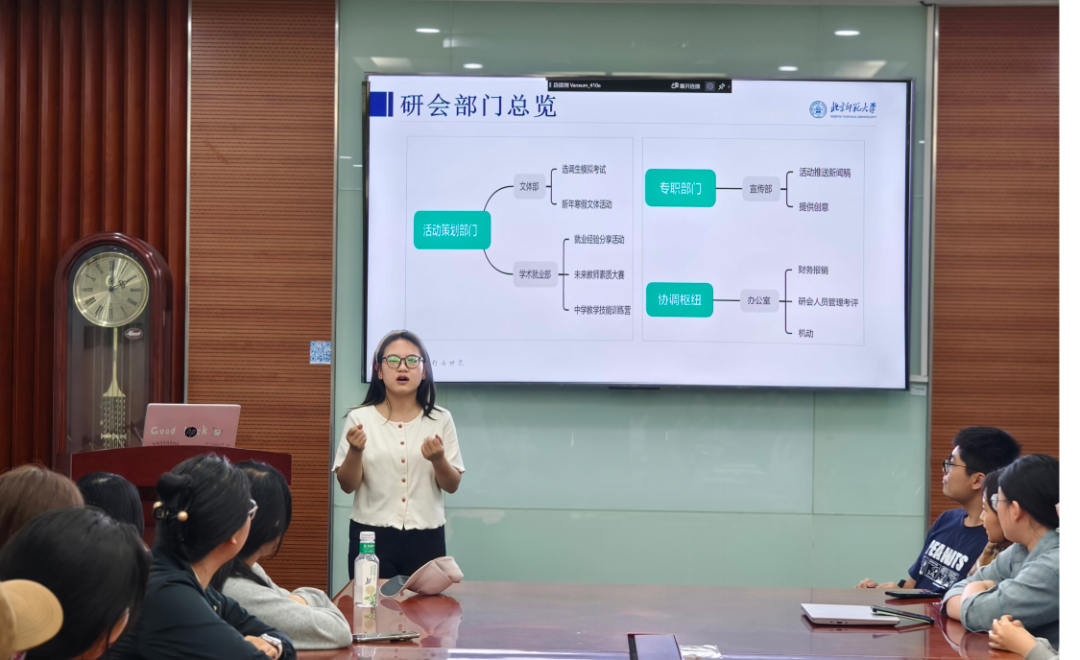 接着,蒋茂婷向新成员们介绍了研会的组织架构和各职能部门,让大家对各部门的工作有了更加深入的了解。主席还回顾了过去一年研会举办的精彩活动,如中学教学技能训练营、新生趣味运动会、未来教师素养大赛、就业分享会等,充分展示了研会过去一年在丰富校园文化生活、服务同学成长成才方面取得的丰硕成果,也激发了新成员们对未来工作的无限向往。
