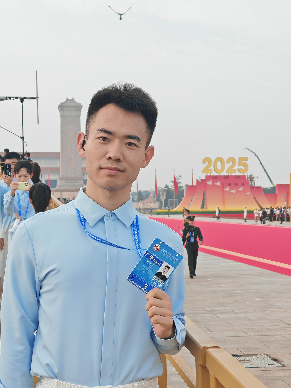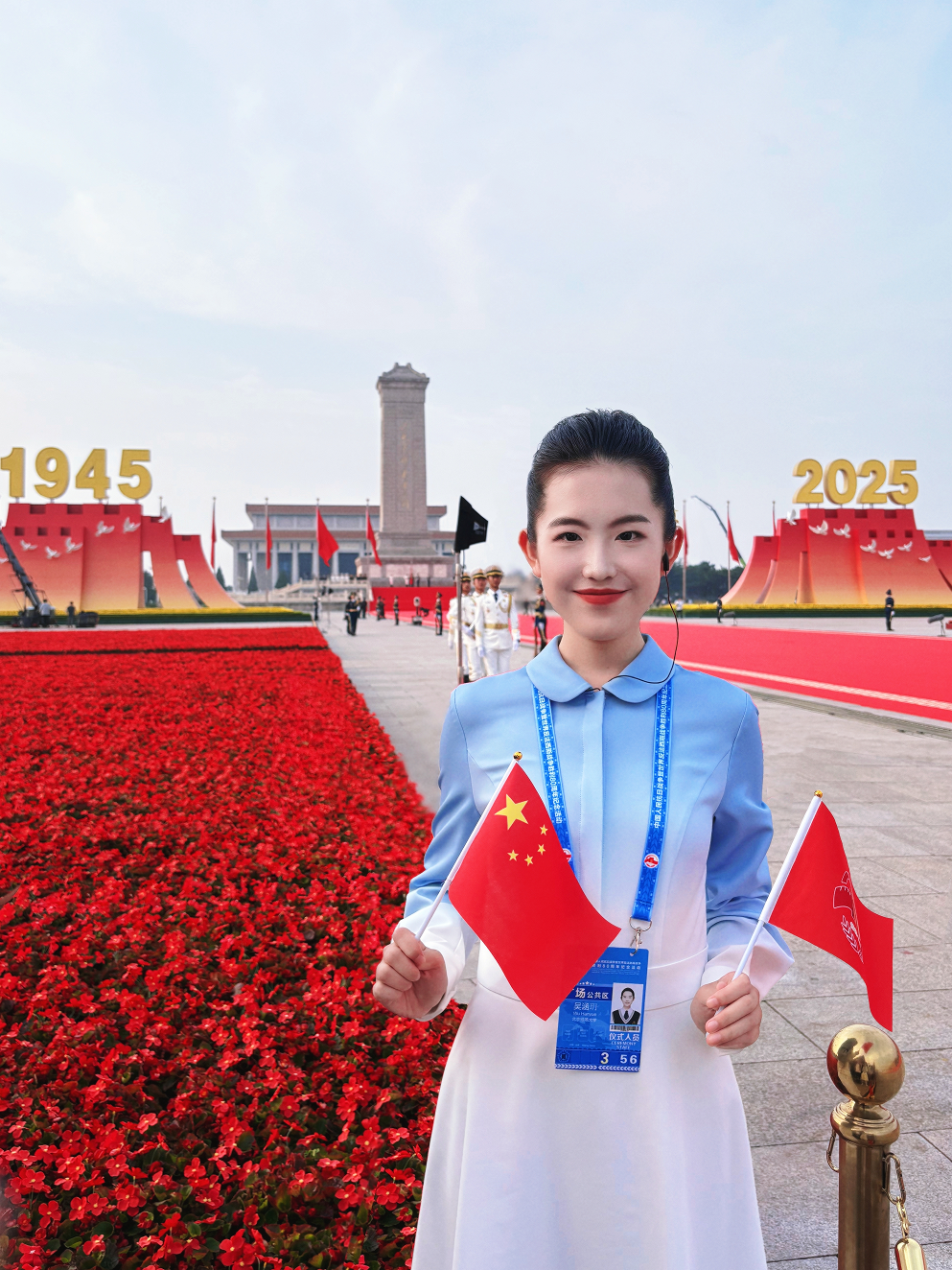 非常荣幸能够作为一名志愿者参与到纪念中国人民抗日战争暨世界反法西斯战争胜利80周年大会的服务保障工作中。从第一次培训到9月3日刚好80天,这些日子里我和其他志愿者们一同经历了连续的培训、凌晨的演练,一起练习过起立转身的节拍和挥旗的节点。