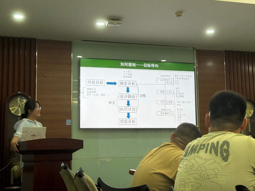 9月12日下午2点,3位师姐师兄为大家带来了干货满满的学业、志愿服务、学生工作的经验分享。首先是2022级本科生文佳怡师姐为大家带来学业生涯规划经验分享。师姐认为可以以目标为导向进行大学规划,然后从课程学习、科研训练、学科竞赛三个方面具体进行说明,提供宝贵的信息。
