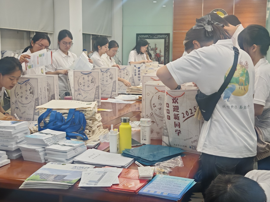 9月13日下午,经过讲解迎新工作流程后,营员们齐心协力、分工合作进行物资装配工作。他们以饱满的热情和认真的态度为即将到来的迎新工作做好充分准备,共同迎接新同学的到来。