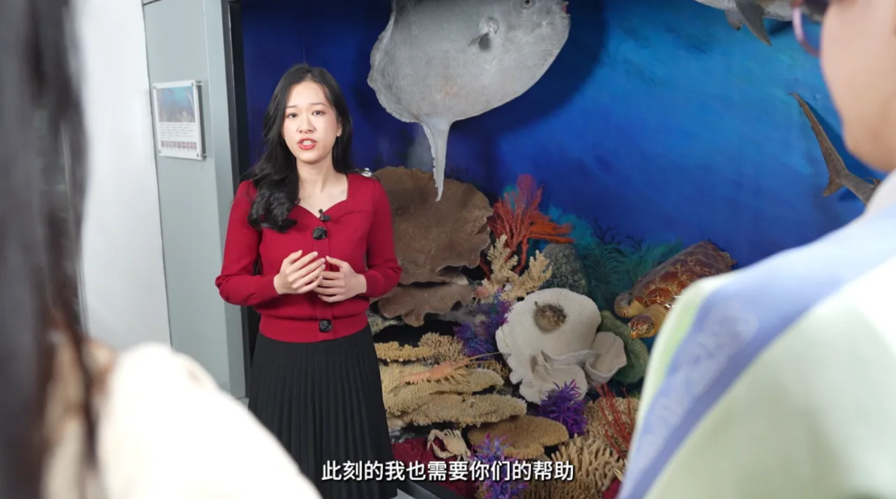 在短短五分钟的视频里,张瑜以一株石珊瑚的口吻,将珊瑚的形成过程、生存困境、重要作用、拯救方法娓娓道来,恳请人们保护珊瑚、保护珊瑚所处的海洋家园。人类肆意破坏海洋生态环境导致“珊瑚白化”的惨象令人触目惊心,珊瑚大量消亡引发的资源短缺、自然灾害令人忧心忡忡,张瑜希望用一帧帧真实的影像、一个个直观的数据让人们意识到珊瑚保护势在必行。然而获取这些视频素材绝非易事,“在京内无法拍摄与海洋、珊瑚礁相关的实景内容,好在北师大动植物标本馆给予了我极大帮助。在学院党委和标本馆王宁老师的倾力协助下,我在馆内拍摄了珊瑚标本、珊瑚礁生态系统模拟景观等场景,丰富了视频内容,提升了视频质量。”这是张瑜第一次自编自导自演科普微视频,她在剧情设计、视频剪辑等方面都取得了很大进步,并期待在未来继续制作新的科普作品。