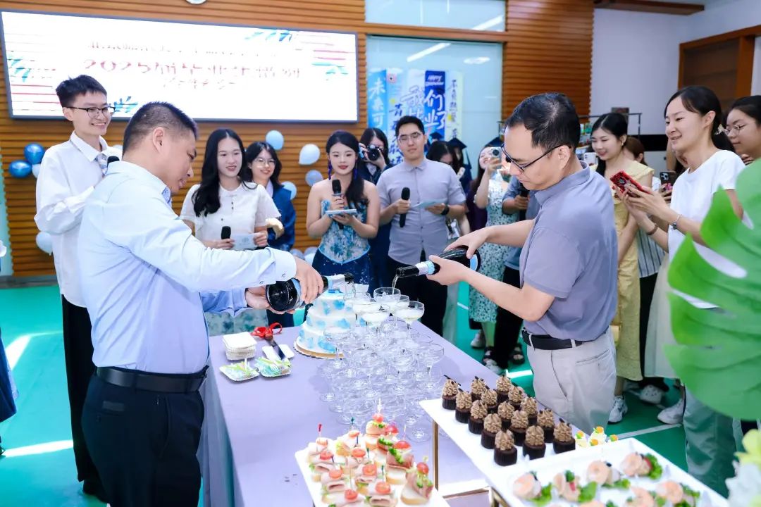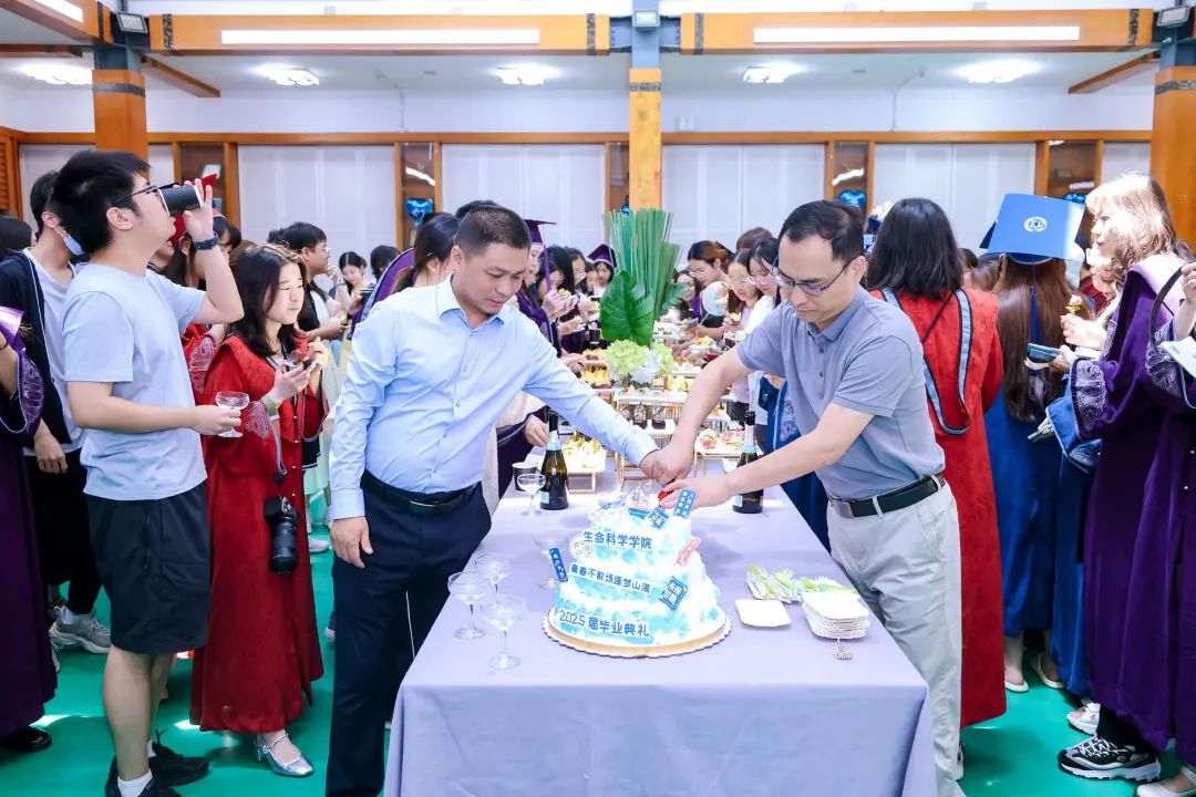 学院党委书记王天明教授和院长窦非教授先后发表毕业致辞,向全体毕业生送上殷切祝福。随后,两位老师共同为精心准备的"香槟塔"斟满饮料,并携手切下象征毕业的第一块蛋糕。在温馨的氛围中,同学们高举手中的高脚杯,共同庆祝在师大生科院求学时光的圆满落幕。