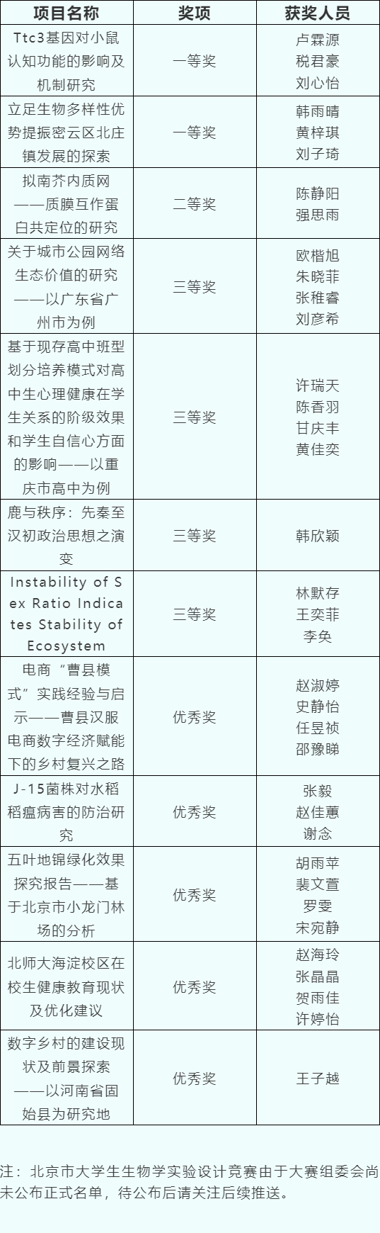 第十届北京市大学生生物学奇思妙想竞赛获奖名单: